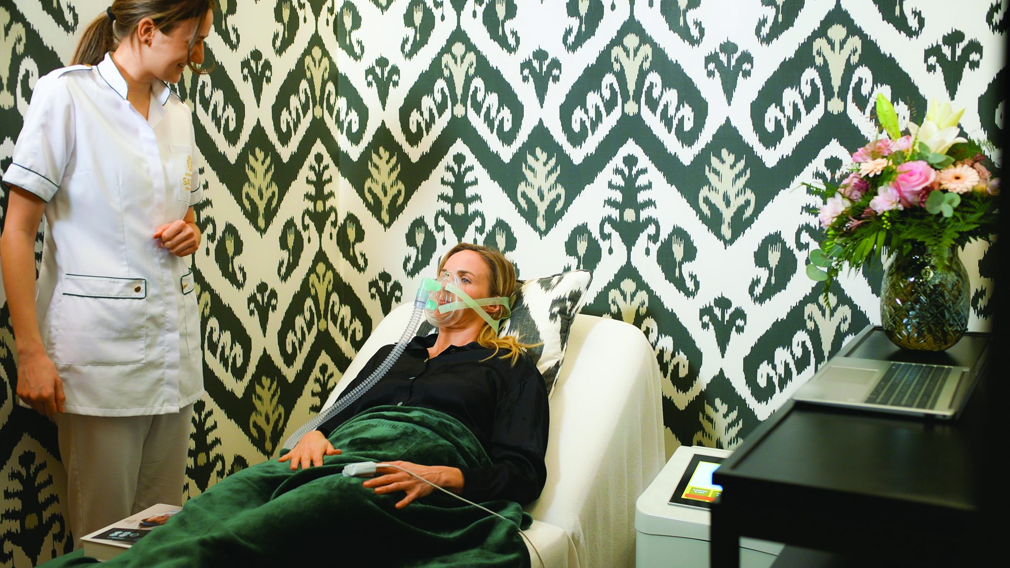 Über eine Maske wechselt man zwischen wenig und viel Sauerstoff. Das regt Stoffwechsel und Zellenergie an, stärkt Herz, Kreislauf, Cholesterinwerte und das Immunsystem. Auch Konzentration und geistige Leistungsfähigkeit können verbessert werden.