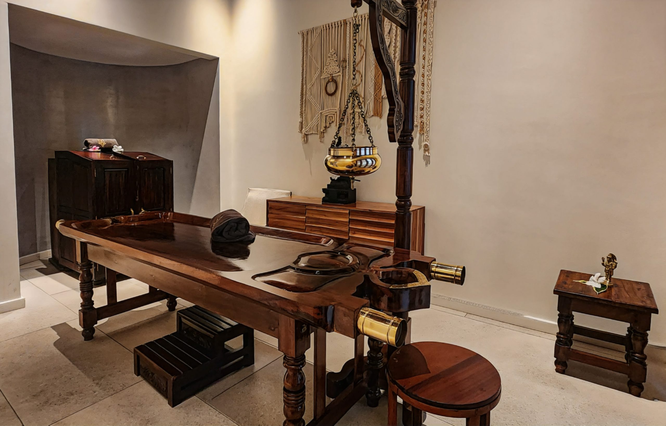 Ein weiteres Merkmal ist die Durchführung der Behandlungen auf dem traditionellen hölzernen Ayurveda-Tisch, dem sogenannten Droni, was die Ursprünglichkeit des Erlebnisses zusätzlich verstärkt. Trotz unserer Treue zu den klassischen Methoden achten wir darauf, dass die Anwendungen sanft und wohltuend sind, in dem Bewusstsein, dass viele unserer Gäste Entspannung und Regeneration suchen, nicht zwingend intensive medizinische Therapien.