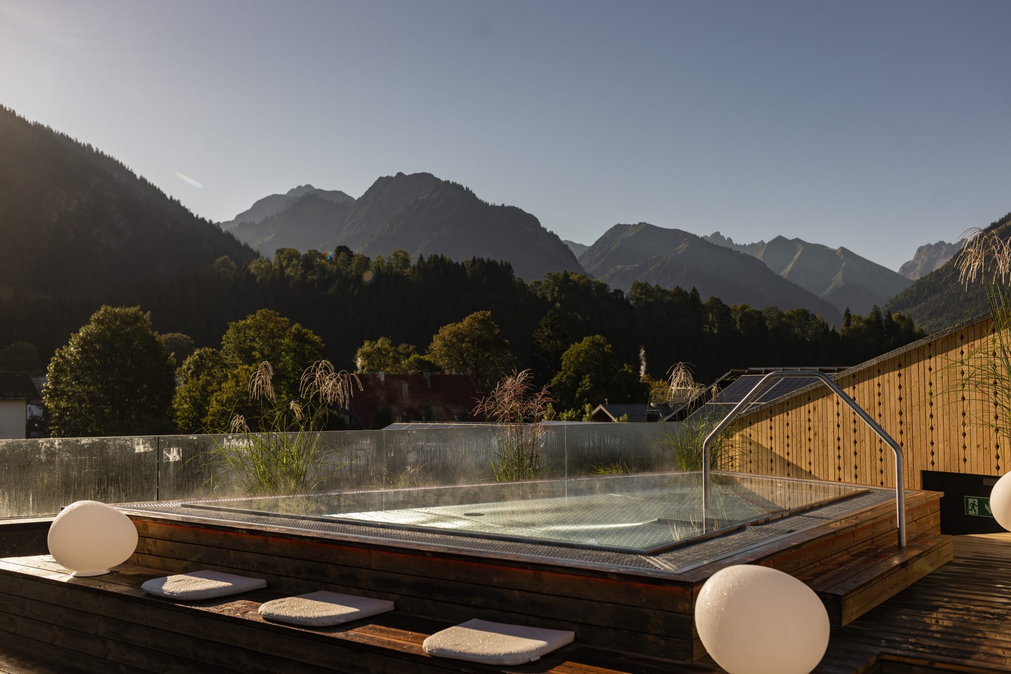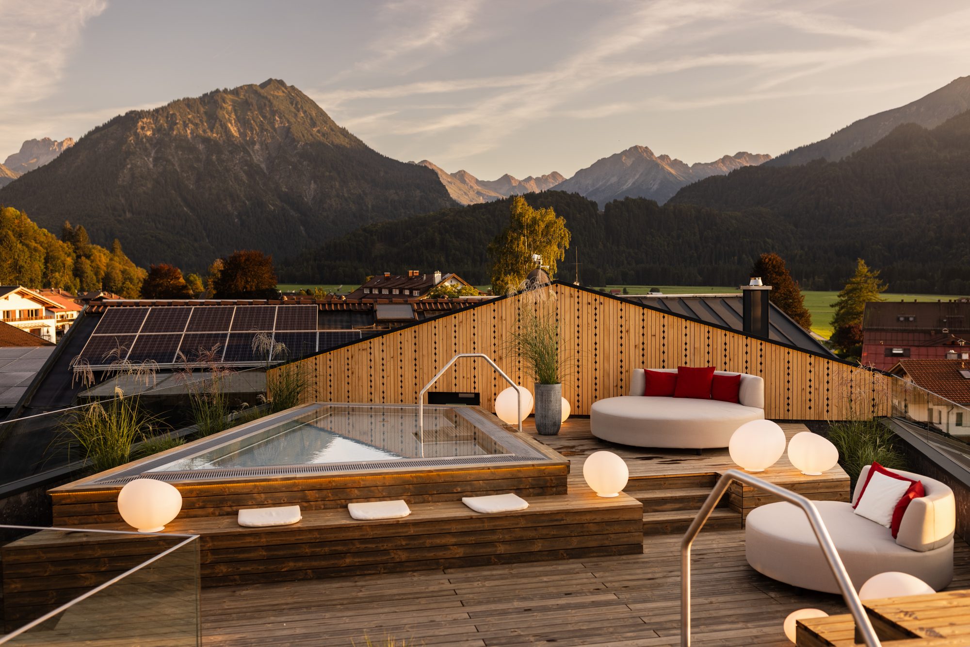 In der Kategorie Wellness sind es vor allem unsere Onsen-Pools auf dem Dach, die herausragen. Die 360-Grad-Aussicht auf die Allgäuer Berge ist absolut einzigartig, insbesondere abends oder im Winter entsteht dort eine Atmosphäre, die viele unserer Gäste als magisch beschreiben. Hinzu kommt die große Vielfalt an Ruheräumen, die so harmonisch im Haus verteilt sind, dass wirkliche Rückzugsorte entstehen.
