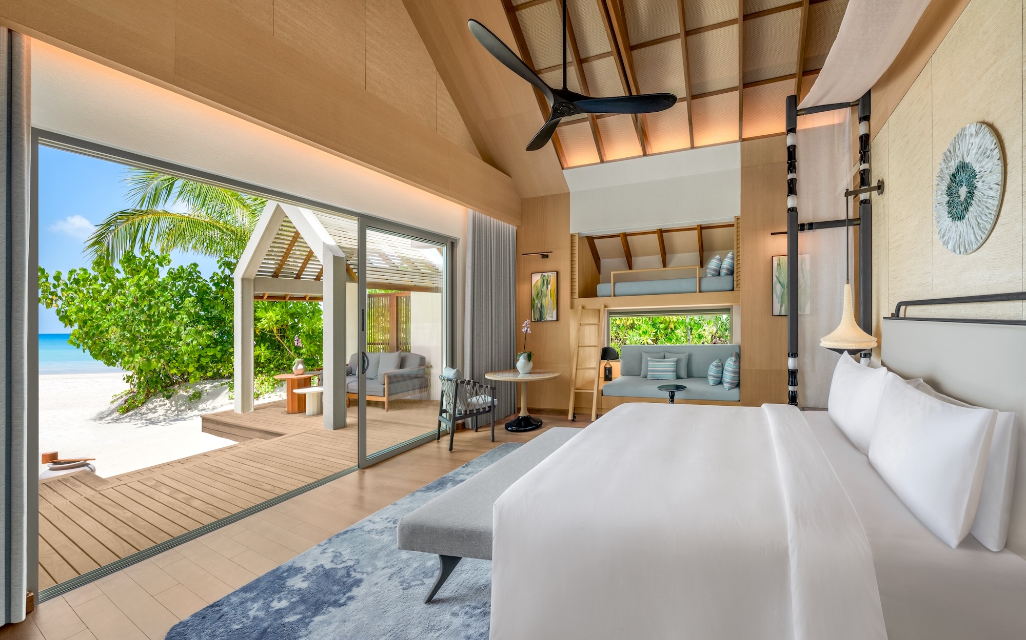 Die Unterkünfte sind stilvoll gestaltet und zugleich perfekt auf Familien zugeschnitten. Besonders gelungen: die Family Beach Pool Villa. Hier erwachen Familien mit direktem Lagunen-Blick, genießen eine großzügige Ankleide und ein modernes Indoor-Bad. Dabei lieben unsere Kinder den privaten Plunge-Pool im weitläufigen Outdoor-Bad und die feinsprühende Regendusche unter Palmen. Ein weiterer Clou für abenteuerlustige Kinder ist die erhöhte Schlafkoje mit Blick ins Grüne und auf das Meer: eine charmante Doppelstock-Nische mit Leiter und Schiebetür, die unsere Kinder sofort zu ihrem Lieblingsplatz küren.