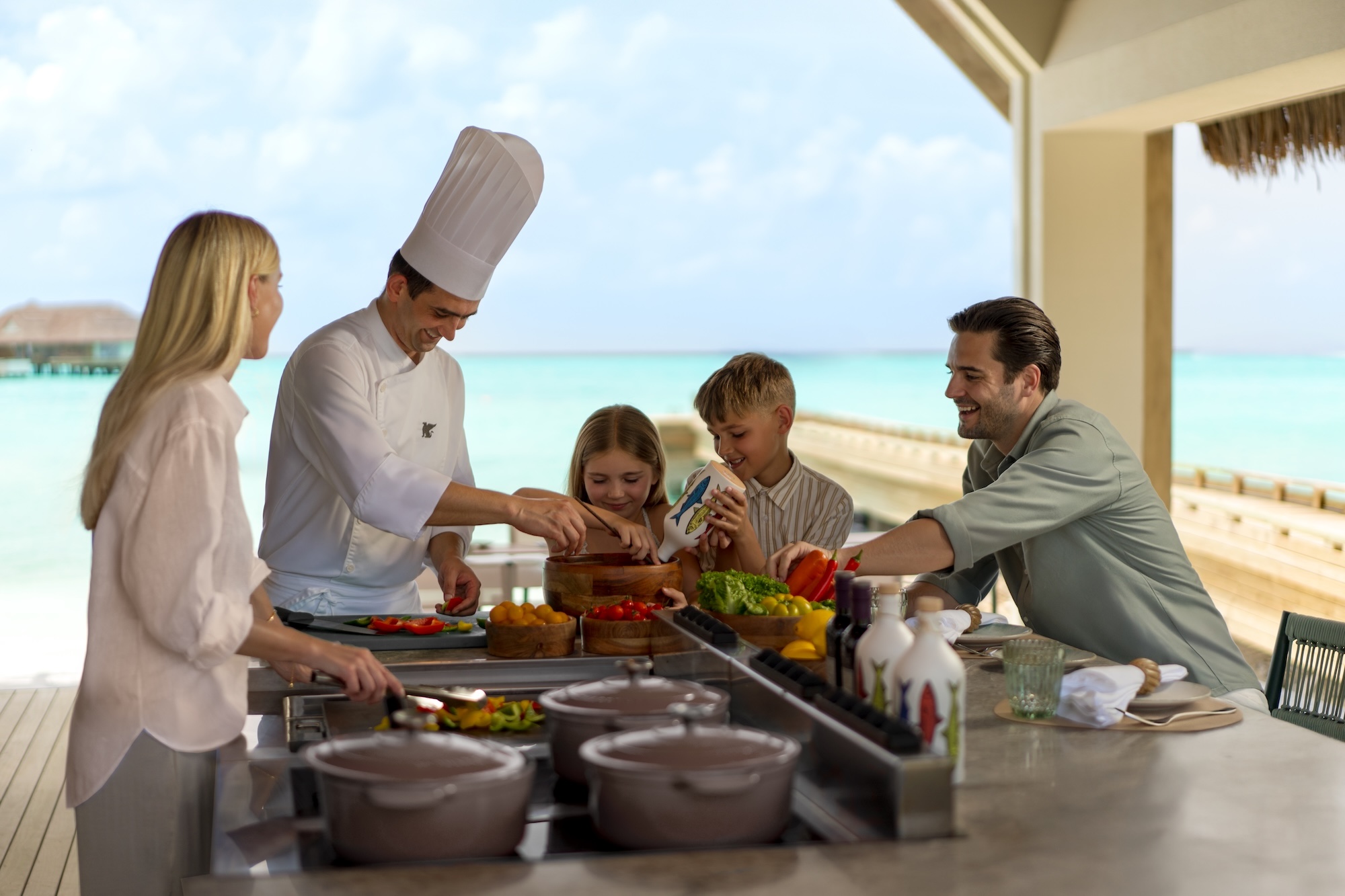 Auch kulinarisch begeistert das Resort: Mit sieben Restaurants und Bars, die von südamerikanischen Spezialitäten über Nikkei-Fusion bis hin zu gesunder Inselküche reichen. Im Herzen der Insel liegt das stilvolle Hauptrestaurant Veyo. Ein unvergessliches Familien-Erlebnis: der Chef’s Table im Pure, einer offenen Küche direkt am Strand. Gemeinsam mit dem Sous-Chef Kundal Singh Kalakoti tauchen Familien bei diesem Kochkurs in die Aromenwelt der Malediven ein. Aus Zutaten des Gartens werden Gerichte wie Tuna Mashuni, ein traditionelles Thunfisch-Kokos-Gericht oder ein herausragendes Fischcurry gezaubert.
