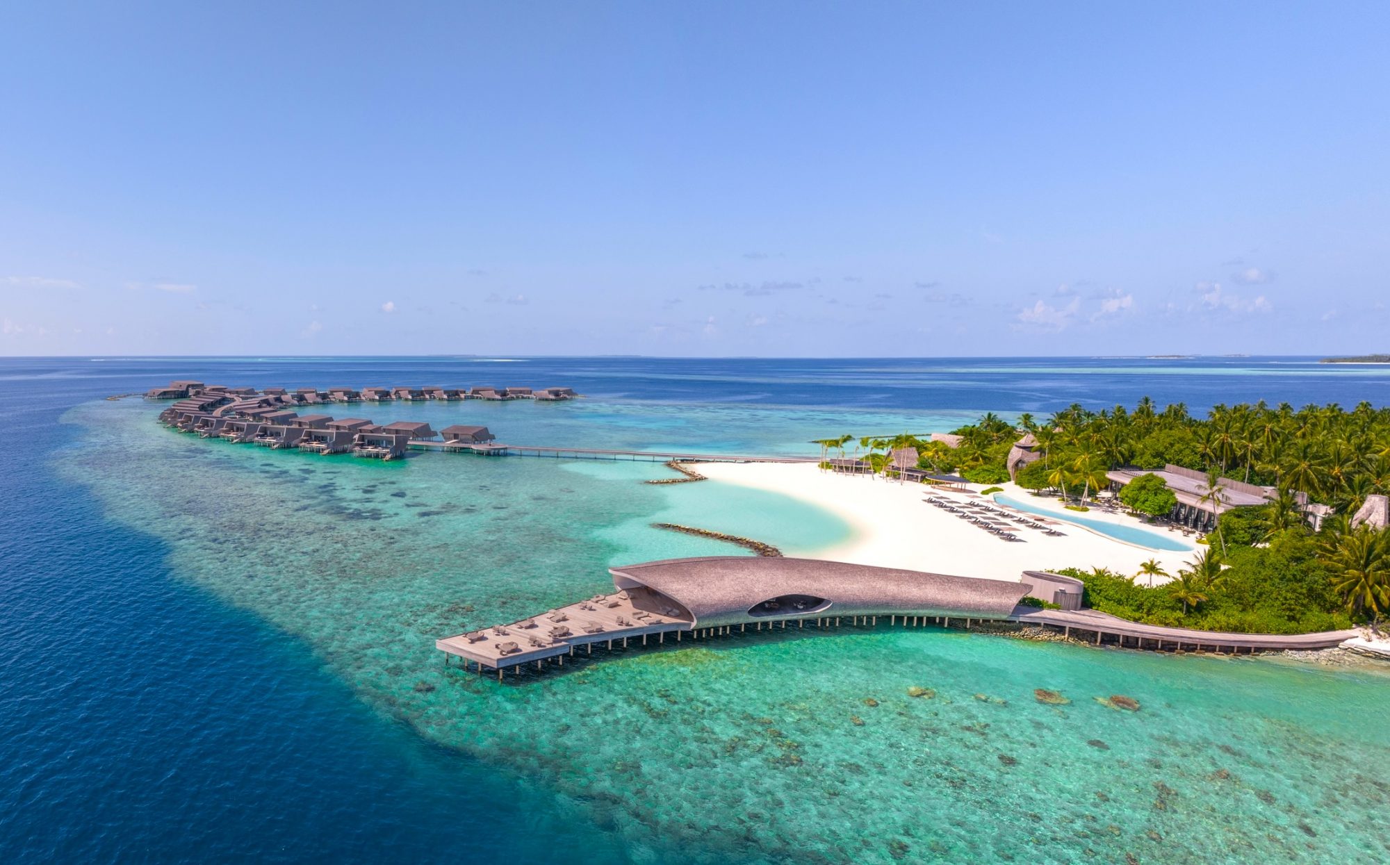 Schon beim ersten Anblick wird klar: The St. Regis Maldives Vommuli Resort ist anders. Abgeschieden und per Wasserflugzeug innerhalb von 45 Minuten erreichbar, liegt das tropische Eiland im einsamen Dhaalu-Atoll, umgeben von tropischer Vegetation und kristallklarem Türkis. Unter der kreativen Handschrift des preisgekrönten Architekturbüros WOW Architects aus Singapur entstand ein Ensemble, das Natur und Design miteinander verschmelzen lässt. Ikonische Bauwerke wie die Whale Bar, deren Form an einen Wal erinnert, verleihen der Insel ihren unverwechselbaren Charakter. Direkt vor dem lichtdurchfluteten Alba Restaurant liegt einer der größten Infinitypools der Malediven, der scheinbar nahtlos in den Indischen Ozean schwappt. Ein Ort, an dem Familien zusammen schwimmen, entspannen und spektakuläre Sonnenuntergänge erleben. Selbst Boutique und Bibliothek greifen mit ihren an Muscheln angelehnten Formen das maritime Thema auf.