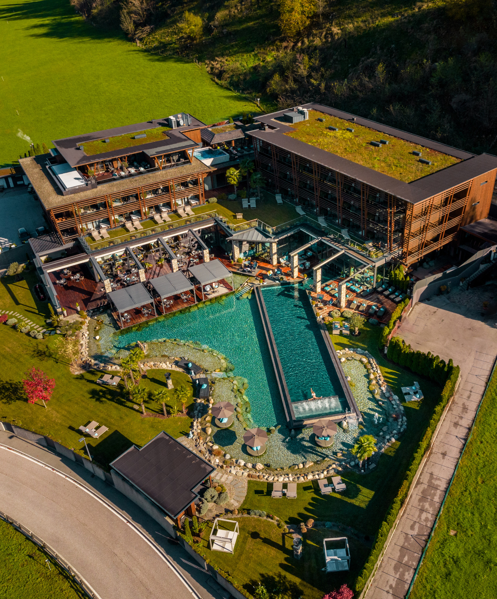 in der Top-Liga Südtiroler Wellnesshotels mit. Auf zwei Ebenen können sich die Gäste hier gesund schwitzen, in den hyggeligen und ansprechend gestalteten Ruhebereichen und Rückzugsnischen, vom bisweilen stressigen Alltag erholen und neue Kraft tanken. Gerade die Outdoor-Event-Sauna setzt im internationalen Vergleich mit den täglich wechselnden Show-Aufgüssen ganz hohe Maßstäbe. Dabei bietet die Passeier Bergwelt ein hervorragendes Surrounding und beschert auch landschaftlich beruhigende und vitalisierende Ausblicke zugleich. Letztere fängt der Gast auch hervorragend in der Rooftop Relax Area ein. Dieser Wellnessbereich, der dem Himmel so nah zu sein scheint, begeistert den wellnessaffinen Gast mit einem ganzjährig auf ca. 36°C beheizten Sole-Infinitypool, einer Rooftop Panorama Sauna und einem ansprechend gestalteten Panorama Ruheraum. Die Dachterrasse lädt zur meditativen Erholung ein. Das Ein- und Ausatmen der frischen Bergluft erscheint hier oben wie ein Balsam für strapazierte Lungen und wirkt zugleich erdend und beruhigend.