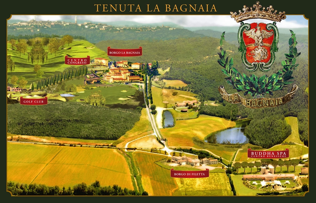 einen das antike Dorf La Bagnaia und die geschichtliche Zoll-Stätte Filetta. Zum anderen ein majestätisches Kongresszentrum in den Hügeln der Toskana sowie das Spa Zentrum „Buddah“, das von